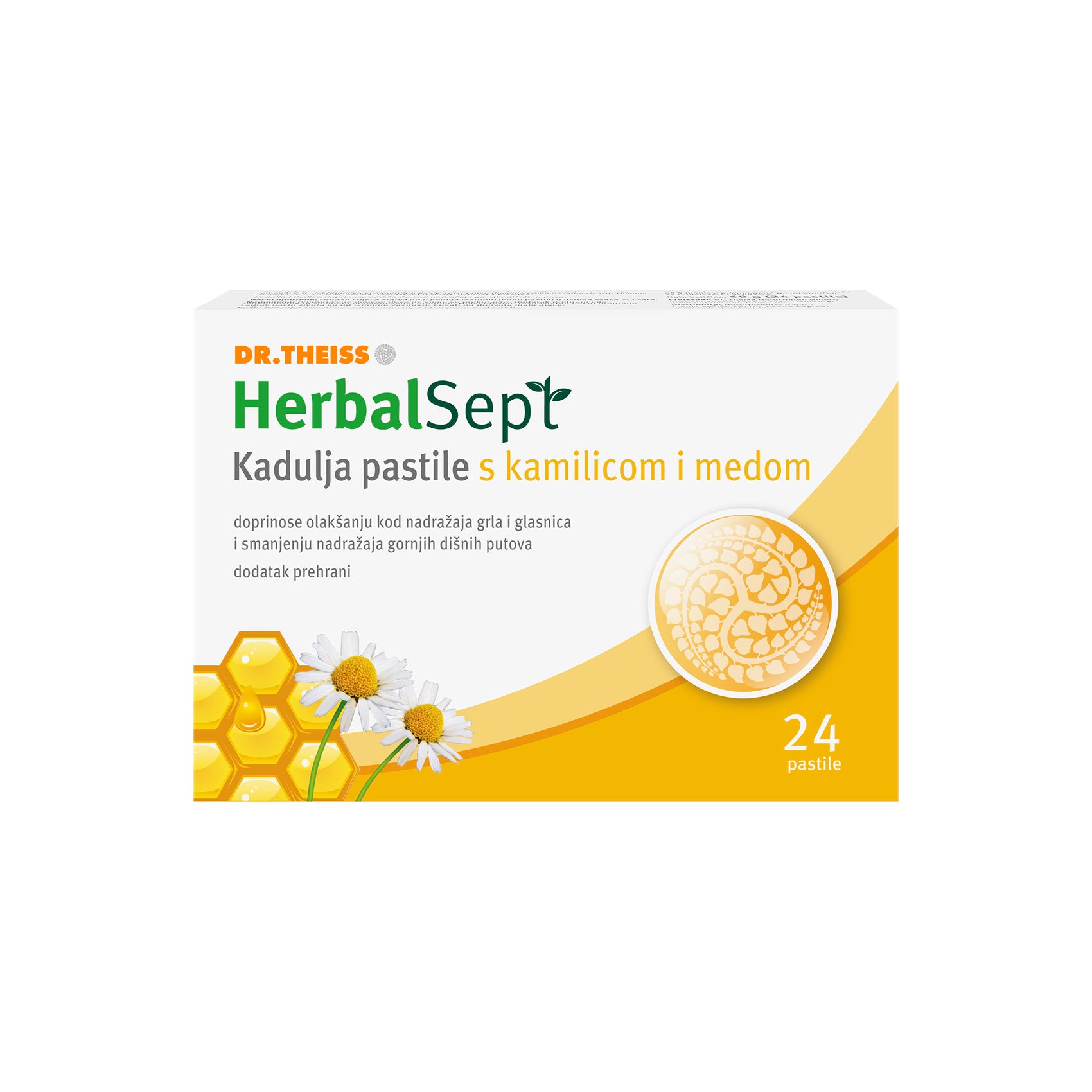 DR.THEISS HerbalSept žajbljeve pastile s kamilico in medom so prehransko dopolnilo, namenjeno vlaženju ustne sluznice in žrela. Vsebujejo izvlečke žajblja (Salvia officinalis L.), kamilice (Chamomilla recutita (L.) Rauschert) in med. Pastilam je dodan tudi vitamin C, ki ima vlogo pri delovanju imunskega sistema ter vlogo pri nastajanju kolagena za normalno delovanje dlesni.